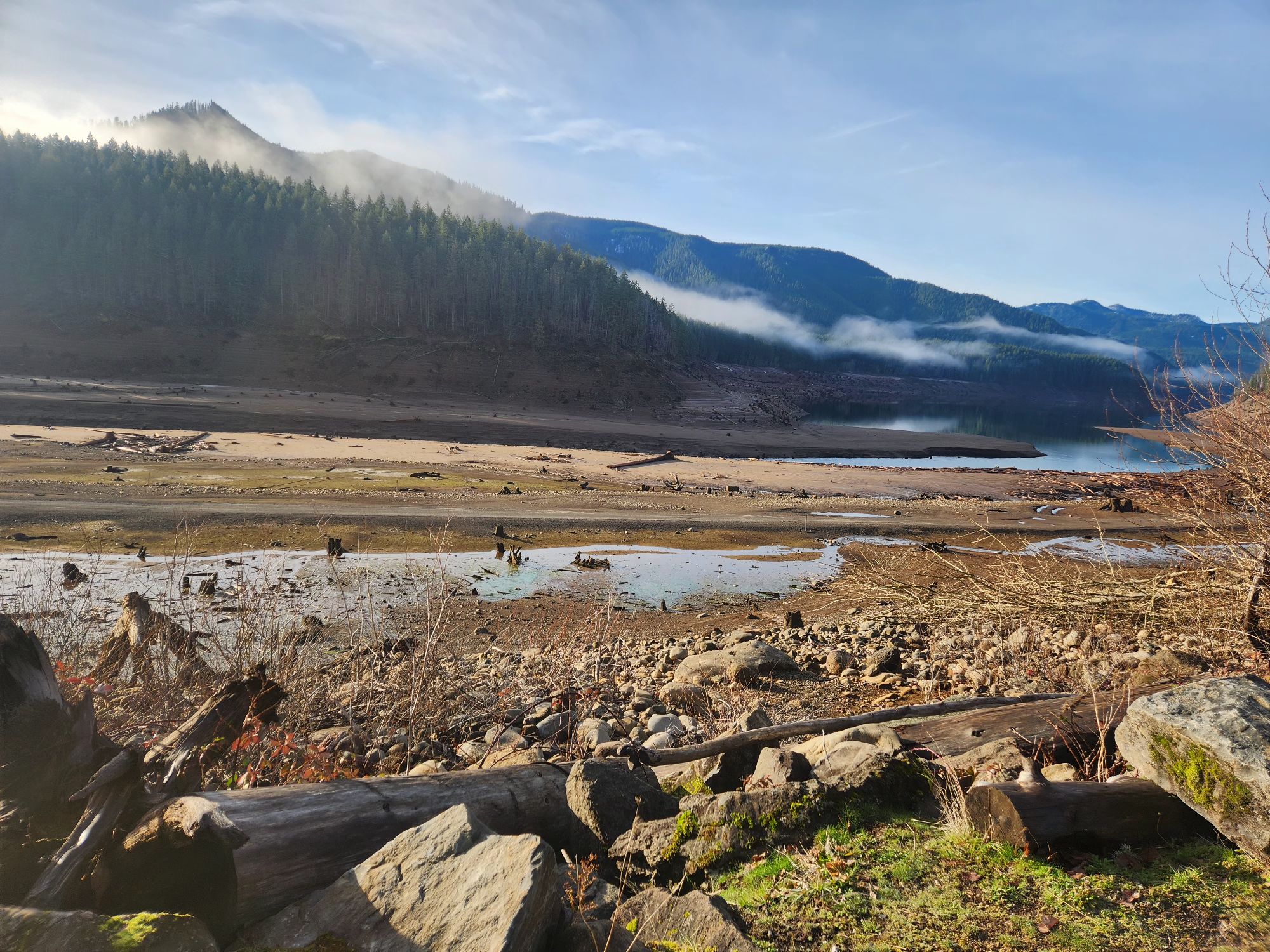 The flood control reservoirs around the Willamette Valley are drawn down for winter to a low water depth river pond in the bottoms.